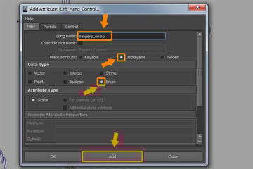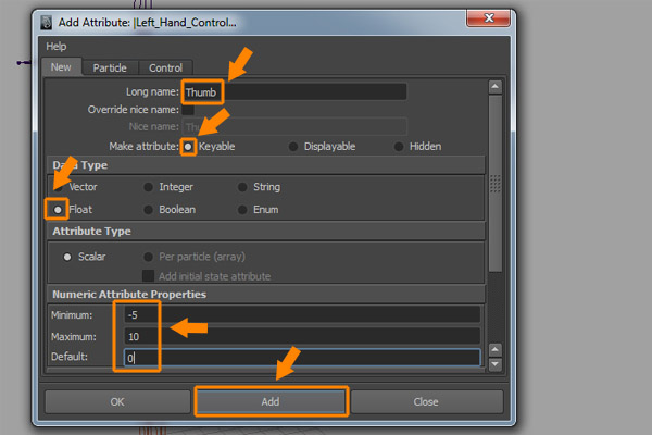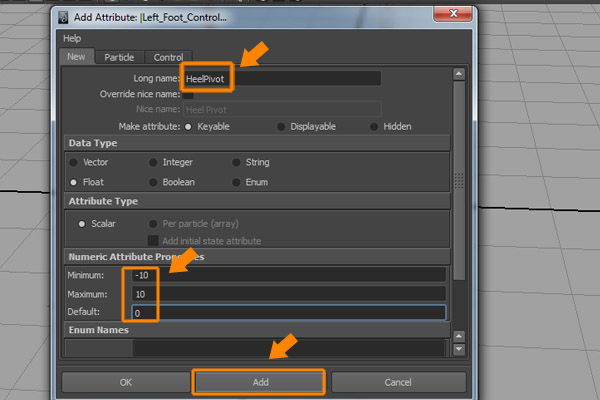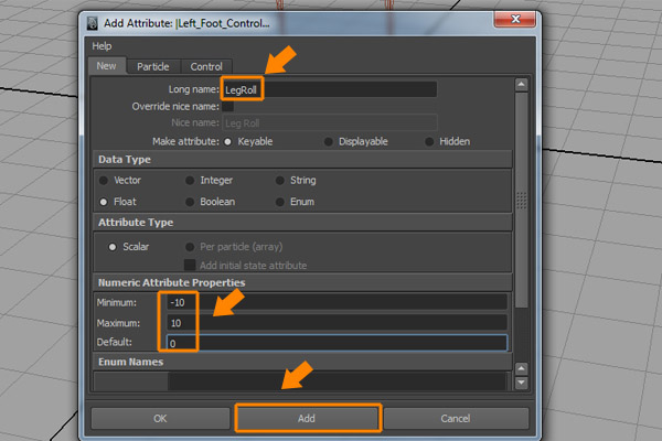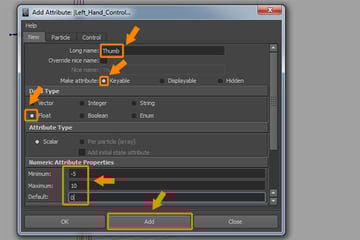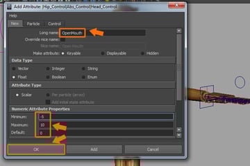 Now, in the Add Attribute window, type "OpenMouth" in the Long name box and turn on the Keyable radio button. Turn on the Float radio button in the Data Type group as well, and then set the values like so: Minimum to -5, Maximum to 10 and Default to 0, and then click on OK.