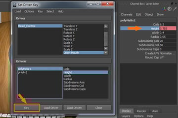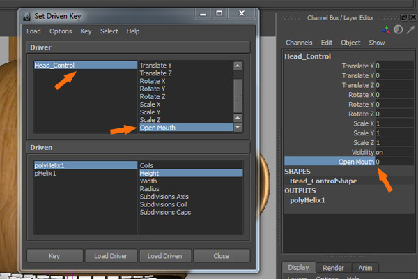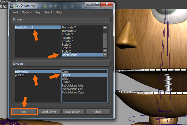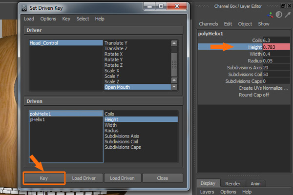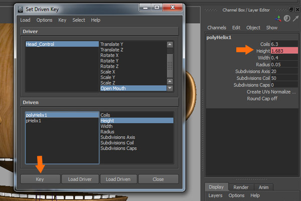 Now in the Set Driven Key window, select the Open Mouth in the Driver group and then select the polyHelix1 and the Height node in the Driven group. With the character’s mouth opened, click on the Key button.