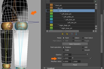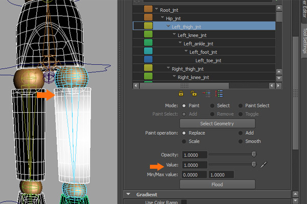 Now with the Left_thigh_jnt joint selected again, set the value of the Value field to 1, and then again paint on the thigh mesh to increase the skin weight values.