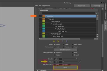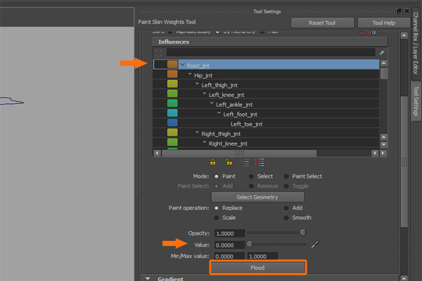 So first with the Root_jnt joint selected, set the value of the slider to 0 and then click on the Flood button to set the skin influence weight to 0 for the hip mesh.