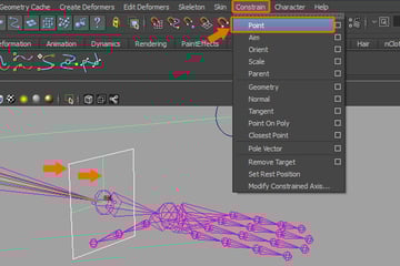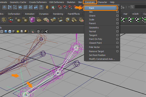 Again select the Left_Hand_Control curve once more, and then select the Left_Hand_IK and go to the Constrain menu and select the Point constrain command.