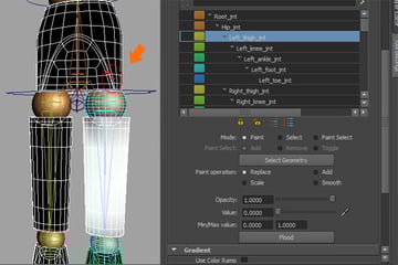 Next select the Left_thigh_jnt joint in the list. You will notice that some of the Left_thigh_jnt joint`s skin influence weight has shifted to the hip mesh.