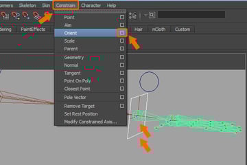Next we need to add a constrain for the hand control. So first select the Left_Hand_Control curve and then select the Left_clavicle_jnt joint, and then go to the Constrain menu and click on the Orient option box to open its settings.