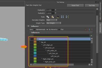 This opens the Paint Skin Weights Tool settings window. You can see the list of the skeleton hierarchy here. Here we can adjust the skin influence weight as per the deformation of the character’s body meshes.
