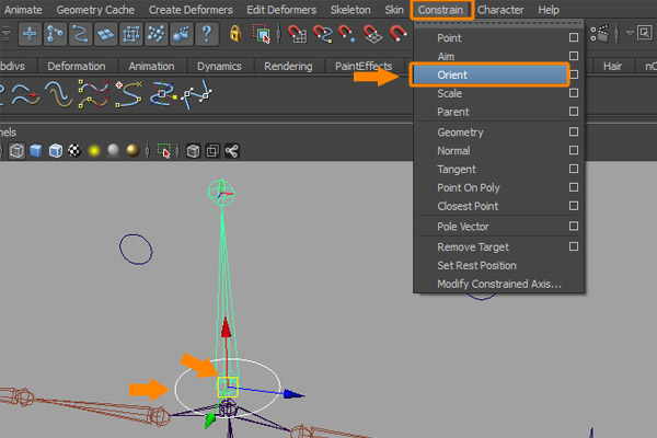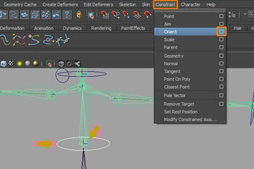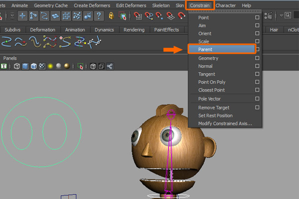 Then go to the Constrain menu and apply a Parent constrain command. Now the head control becomes the parent of the both eyes control.