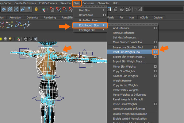 Select all the body parts of the character, and then go to Skin menu and click on the Paint Skin Weights Tool options box, from inside the Edit Smooth Skin submenu.