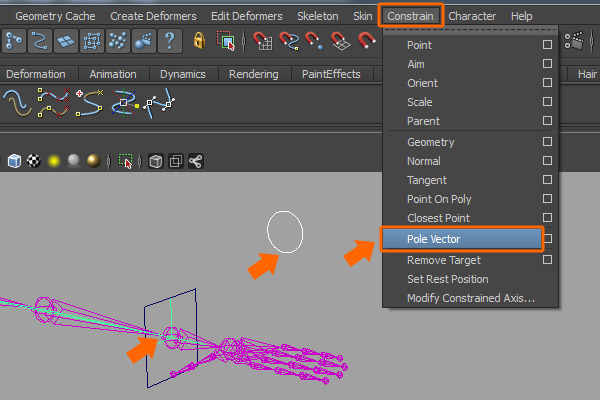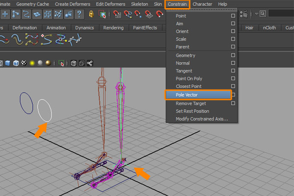 Now we will apply different constraints to the elbow control. So first select the Left_Elbow_Control curve and then select the Left_Hand_IK, and go to the Constrain menu. This time select the Pole Vector constrain command.