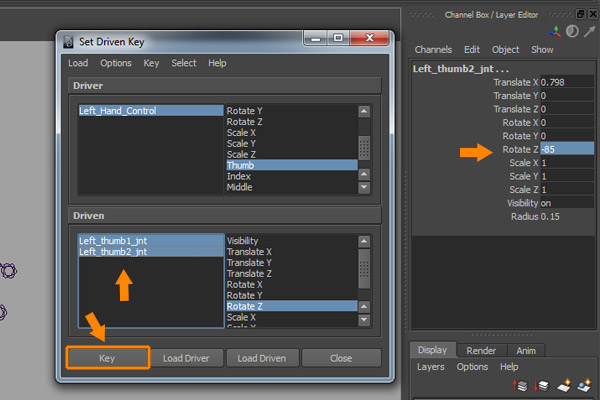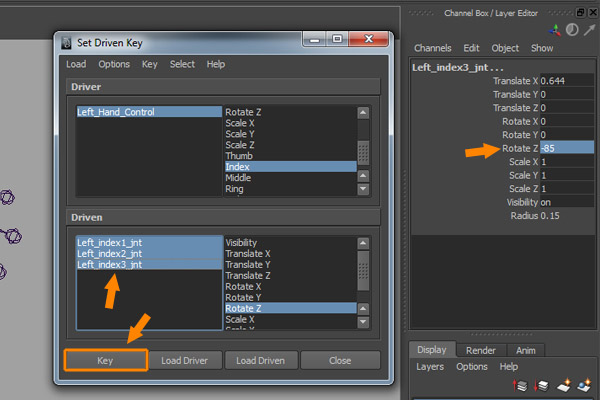 Now again with all the Index joints selected in the Driven group, set the Rotate Z value to -85 and then click on Key.