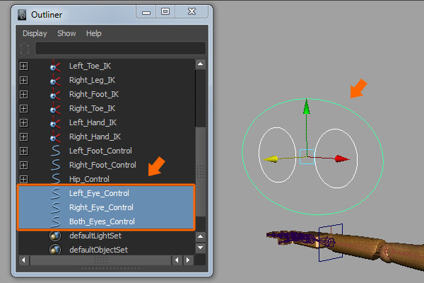 Now rename these eye control curves: "Left_Eye_Control", "Right_Eye_Control" and "Both_Eyes_Control" in the Outliner window.