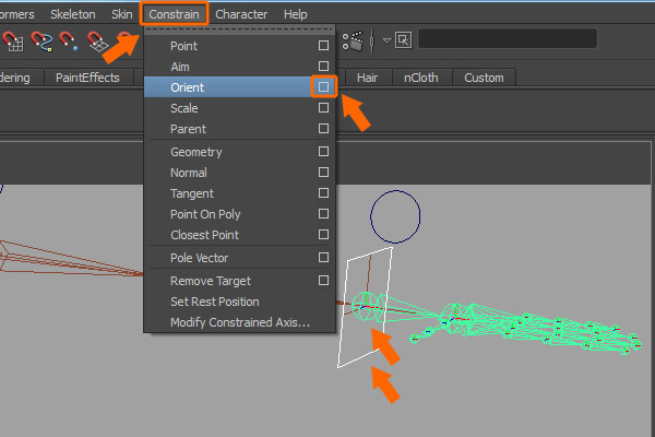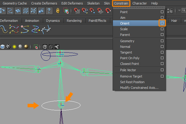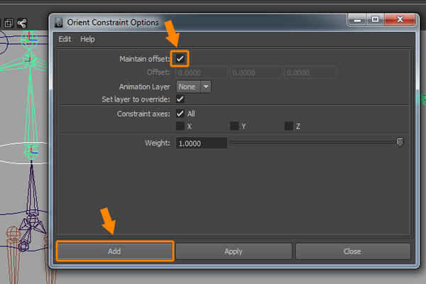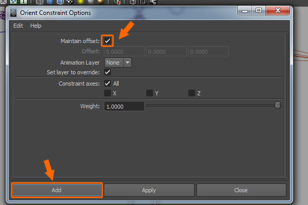 In the Orient Constraints Options box, check on the Maintain offset check box and then click on the Add button to apply the orient constrain to the selected objects.