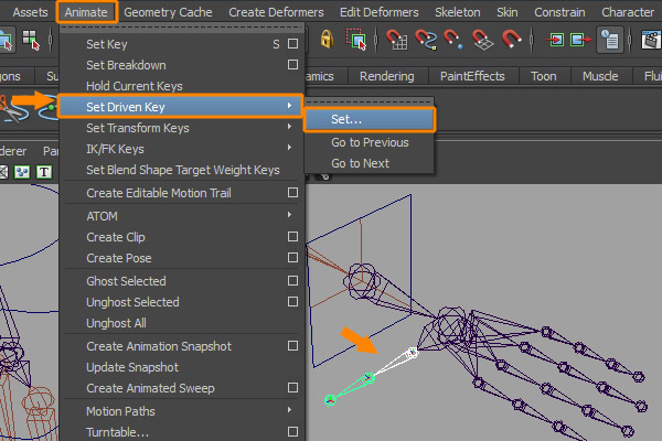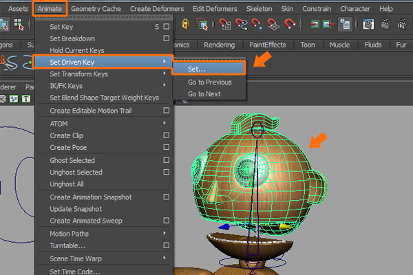 Now, first select the entire upper head mesh and then go to the Animate menu and click on Set.., from inside the Set Driven Key submenu.