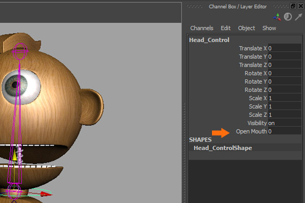 Again with the Head_Control curve selected in the channel box, set the Open Mouth value to 0.