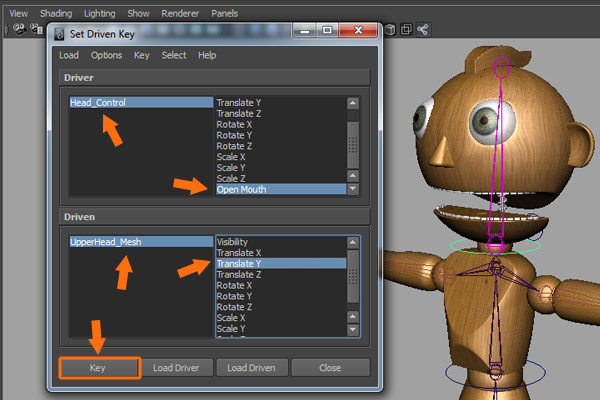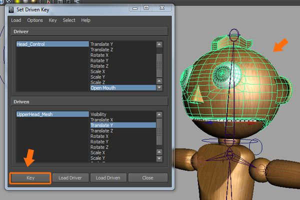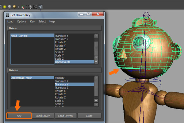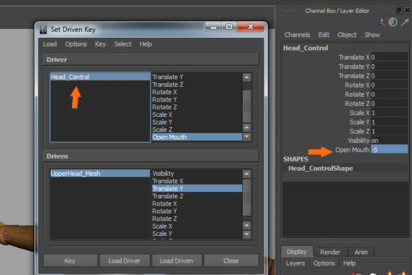 Now with the Open Mouth selected in the Driver group, and the UpperHead_mesh and Translate Y selected in the Driven group, press the Key button to add the initial key.