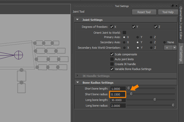You can see the joint tool options on the left side. Here keep the Short bone radius value as 0.1500.
