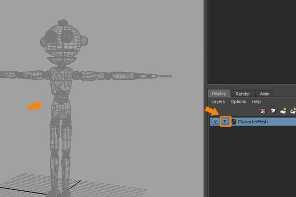 Also click on the Template/Reference button and turn it to a "T" (for Template mode) to start creating joints inside the character mesh.
