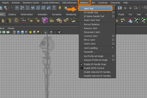 Now jump in the side view and while in Animation mode, go to the Skeleton menu and then select the Joint Tool command to create the joints.