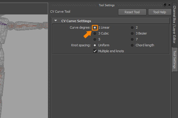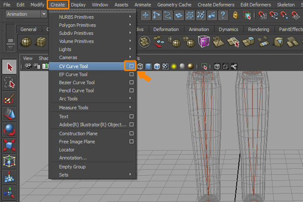 Now to start creating the controls, first go to the Create menu and then click on the CV Curve Tool options box to open it.
