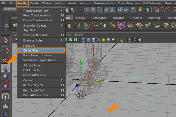 Now you will notice that the rectangle's gizmo appears at the grid's origin. So we have to move the gizmo into the center of the rectangle curve. So with the shape selected, go to the Modify menu and select the Center Pivot command to center the pivot.