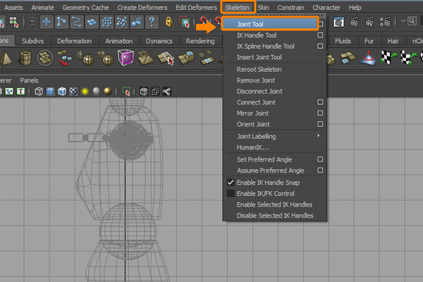 Now we will create the torso joints. So again go to the Skeleton menu and select the Joint Tool.
