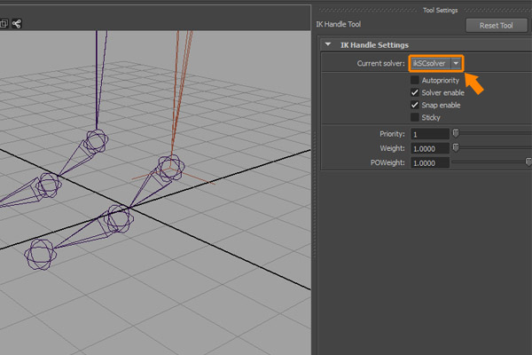 Again open the IK Handle Settings and now change the Current Solver to iKSCsolver (Single Chain Solver).