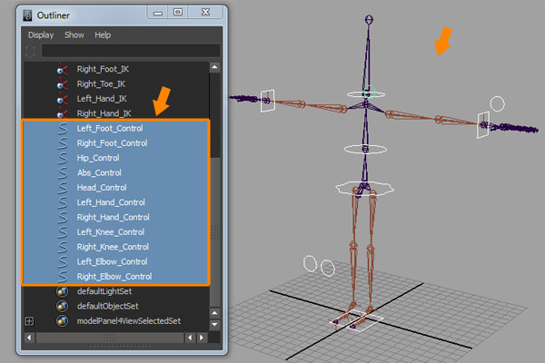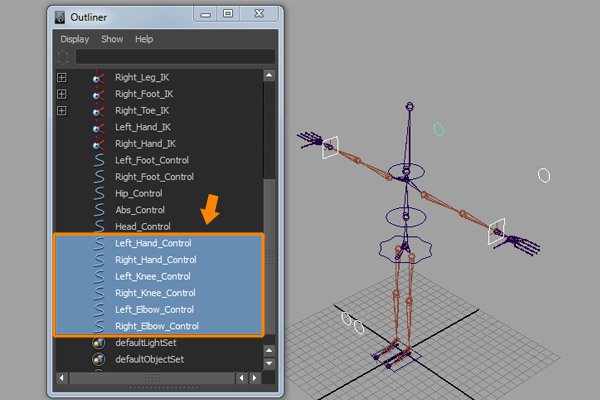 Do same for the left side hands controls. So first select the Left_Elbow_Control curve and then select the Left_Hand_Control curve, and press the P key.