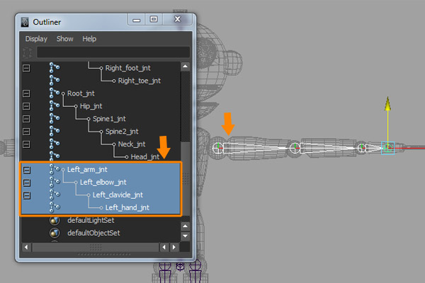 Now open the Outliner window and rename these joints as "Left_arm_jnt", "Left_elbow_jnt", "Left_clavicle_jnt" and "Left_hand_jnt".