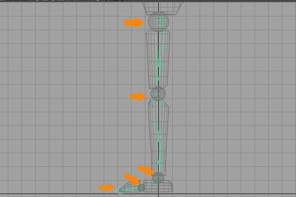 With the Joint Tool selected, draw five joints from the thigh to the toe tip as shown in the image below.
