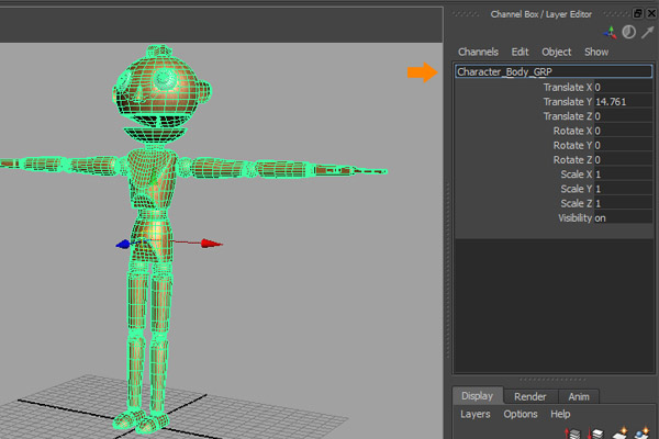 And then rename this group as "Character_Body_GRP" in the Layer Editor, and then move it up a bit to place it firmly on the grid.