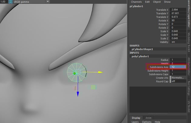 Start Maya and open the file which was saved in the last part of the tutorial series. Create an iris for Goku. Create a cylinder and reduce the subdivision axis.