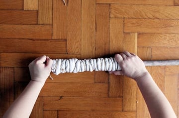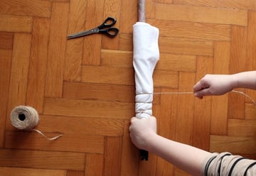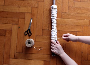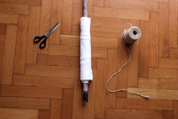Start wrapping the twine around the rod, tying the T-shirt tightly as you move upwards.