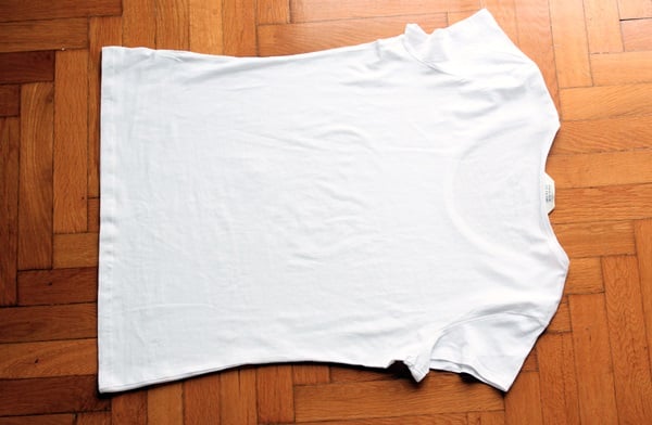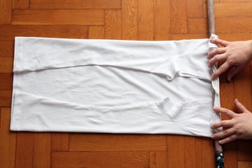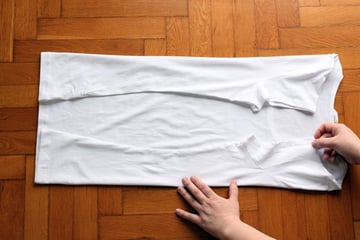 Make two vertical folds, bringing the sleeves inwards on the main body of the T-shirt. Make sure that the folds are straight and vertical and try to smooth any wrinkles on the fabric.