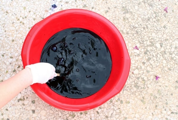 Heat some water and mix the fabric dye, the fixative and salt (optional) in the vat, either by following the instructions on the packet of dye you're using, or by following my instructions in my shibori for beginners tutorial. Make sure to wear gloves and protective garments to avoid getting messy. If you want to protect your floor or working surface, use a plastic drop-sheet.
