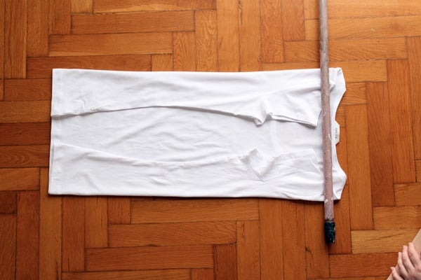 Now hold one end of the rod and move the T-shirt down the rod with the other hand. Squeeze it as much as possible to create a scrunched effect on the fabric.