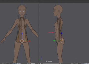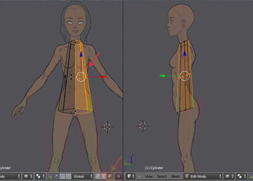 With the Cylinder selected, press the S key and then Scale down the cylinder according to the size of the torso shown in the reference images.