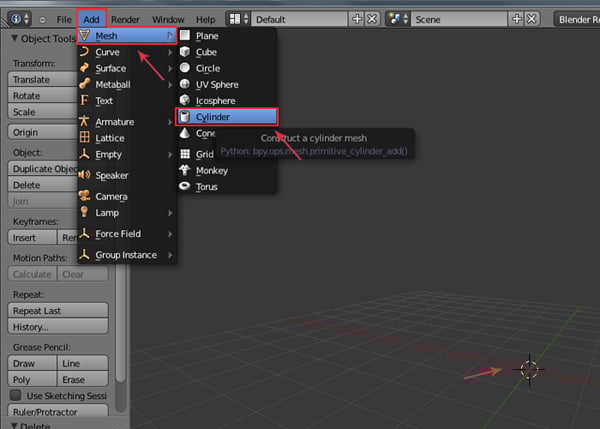 Go to Add > Mesh > Cylinder to create a cylinder at the origin.
