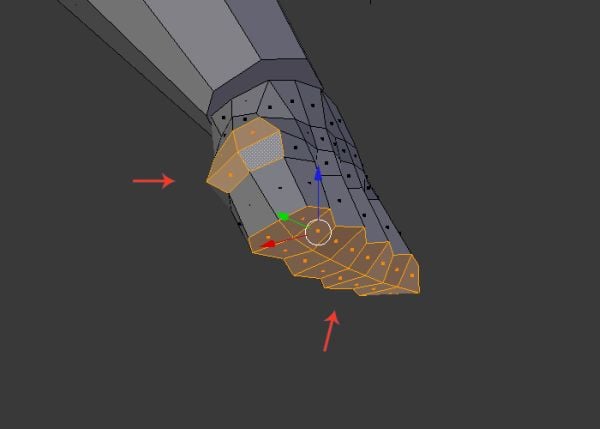 So, while in Face selection mode, select the four faces indicated below on the arm. Press the E key to Extrude and then Scale them down a bit as shown.