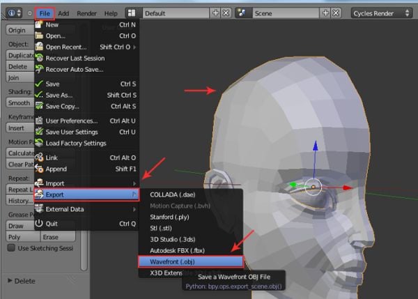 With the half head mesh selected, go to File > Export > Wavefront (.obj) to export the selected mesh file as Head Mesh.obj.