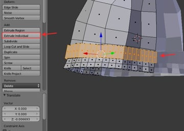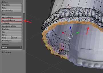 Following the same process, select the faces of the lower part and use the Extrude Individual tool again.