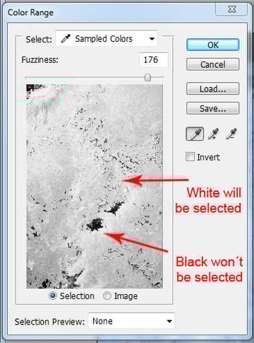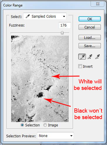 In this step we will add ice above the demon's head and hand. Open the picture of ice. Now go to Select > Color Range... and set the value Fuzziness to about 170. Color Range is a useful tool if you need to make selections based on their color or tonal value.