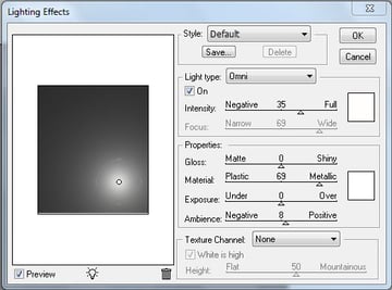 Now we'll add some more dramatic lighting. Add a new layer on the top of your layers and fill it with a solid mid gray (#808080). Change the Blending Mode on Overlay. Now go to Filter > Render > Lighting Effects... and set the menu as you can see below, then press OK.