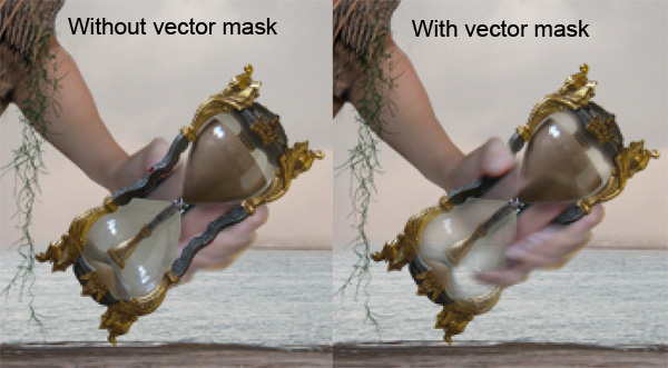 Open the picture with the hourglass and make a selection of it. Then drag it into the manipulation, change the size and rotate it (Command + T) so that it has the same direction as the hand. Add a vector mask and select a small round brush, set the opacity of the brush on at a low value of around 15%, pick a black color and start to paint over the parts of the hourglass that should be semi-transparent (mainly glass).
