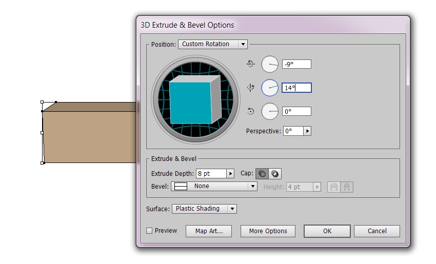 Apply a 3D effect to the shape (Effect > 3D > Extrude & Bevel), using the following angles: