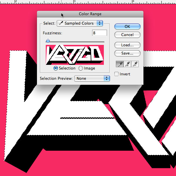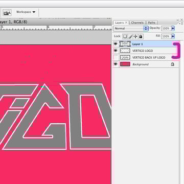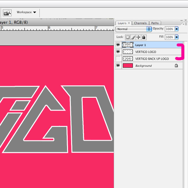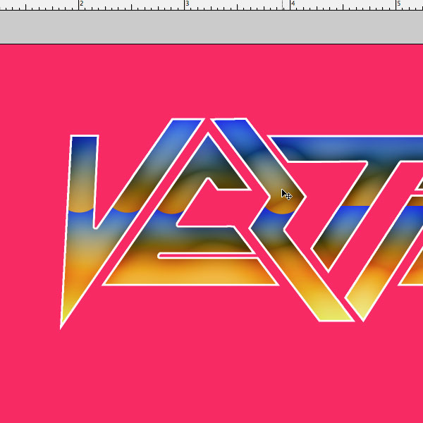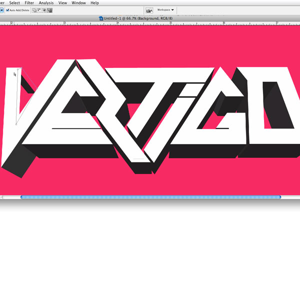The results of the 3D extrusion in Illustrator are now copied and pasted onto a pink background in Photoshop. I ran into a glitch area in the 3D extrusion that caused me to have to fill in the area on the V.