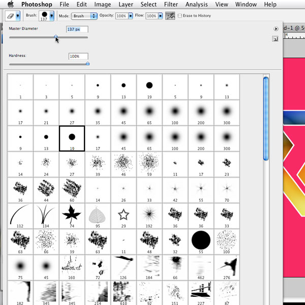 I chose an eraser brush with a hard edge and large enough so that when I erased it would give me a nice arch the width of my text.