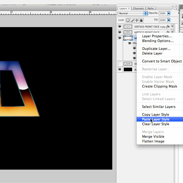 I pasted the Layer Styles from the main logo face onto my outer white layer that is to serve as the bevel on the 3D text.