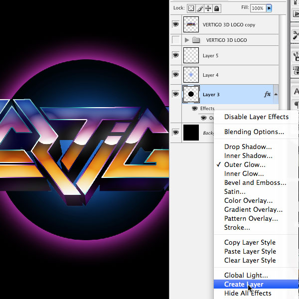 I wanted to experiment with the Outer Glow on it's own layer so I right-clicked the layer style and choose "Create Layer."
