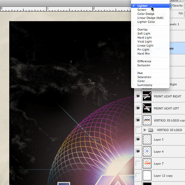 I copied and pasted my lighting layers and circle blended layer and flipped horizontally to get a symmetrical composition. I suppose you could stop at this point and have a slick looking image as is, but I wanted to experiment with some textures to really give it a retro-grit feel.