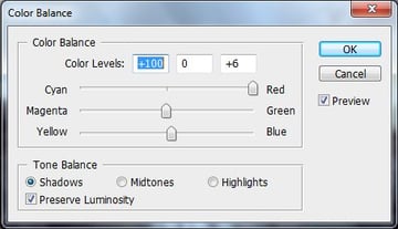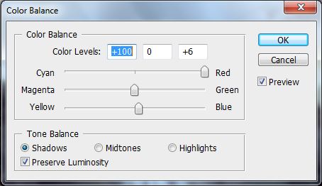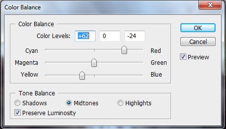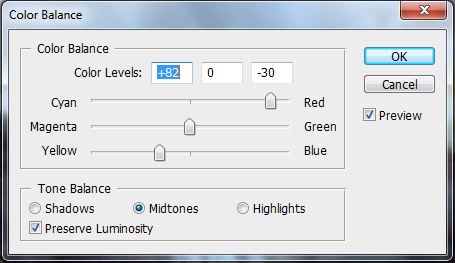 Now we will add some more colors from the sunset. Add new adjustment layer Color Balance on the top of all layers and set the values as you can see bellow: