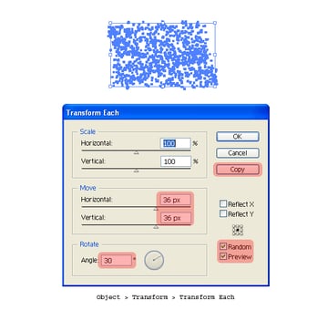 The base for our splatter is now ready. Select all the elements and click on Object > Transform > Transform Each (Alt + Shift + Command + D). Enter 30px each for Horizontal and Vertical Move. Enter 30 degree for the Rotation and enable the Random option. Now click on Copy. (Note: We are applying the transform effect on individual elements. So, do not group the elements).