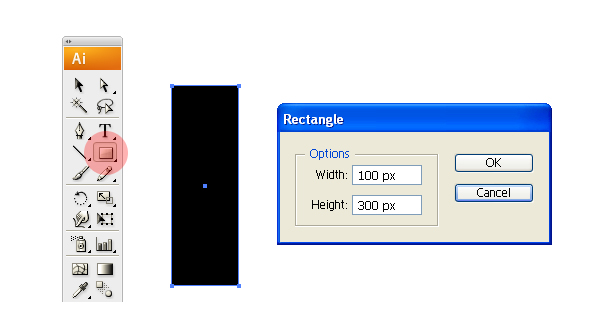 Create a new document. Now use the Rectangle Tool (M) to draw a rectangle of 100px by 300px and fill it with your favorite color. There is no specific rule about the size. You may start with any approximate size and shape here; this is just the size I used.